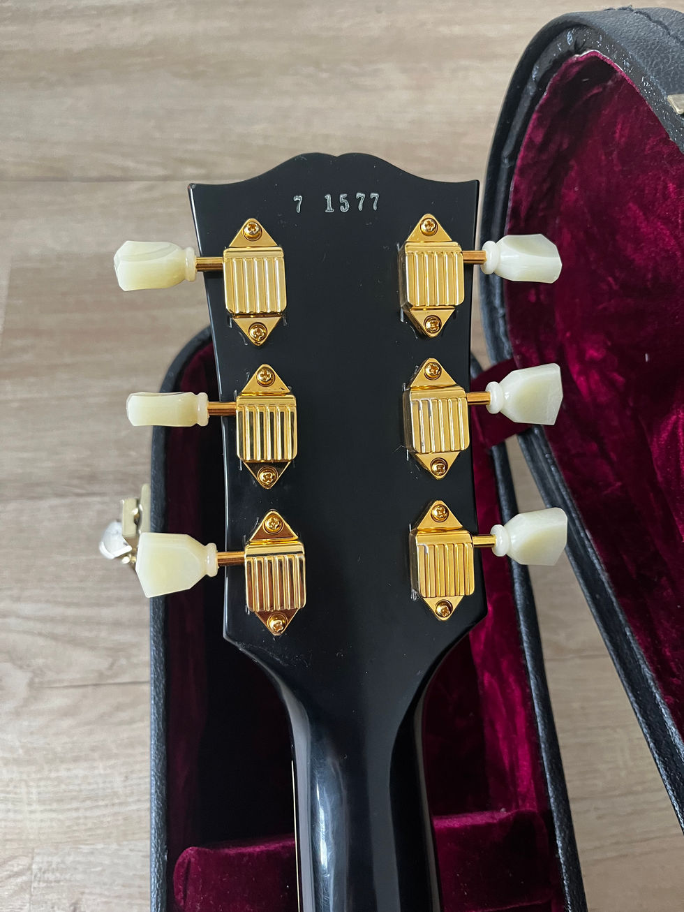 The guitar is officially known as the “LPB7” model. It is a very elegant and vintage-correct Custom Shop Les Paul with a mahogany carved top as well as a solid, non-weight relieved mahogany body and one-piece neck with a hearty “baseball bat” profile carve.